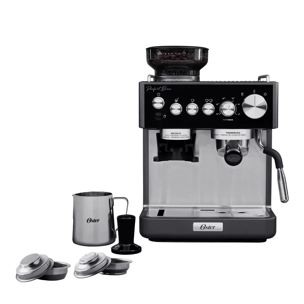 Con la cafetera espresso Oster Perfect Brew, preparar un delicioso espresso en casa es más fácil que nunca. Su molinillo cónico de muelas, con 30 configuraciones, muele café fresco sin derrames, gracias a su tecnología antiestática que asegura que caiga directamente en el porta filtro. Extrae un espresso sencillo o doble con solo presionar un botón, mientras que el tubo de vapor Tempsense™ crea la micro espuma perfecta para tus capuchinos y lattes. Además, su botón de fácil limpieza y los accesorios profesionales incluidos te permiten disfrutar de una preparación fácil y sin complicaciones.